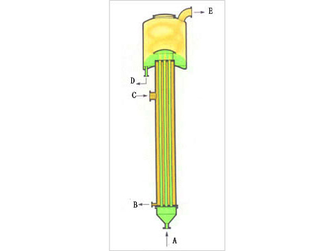 升膜式蒸發(fā)器又稱爬升膜蒸發(fā)器,它依據虹吸泵原理操作,根據在沸騰過程中產生的蒸汽氣泡的升力,液體和蒸汽并流向上流動,同時,產生的蒸汽量增加,從而,在管壁上產生流動的膜,即液體向上“爬”。并流向上運動有肋于在液體中產生高度的湍流。